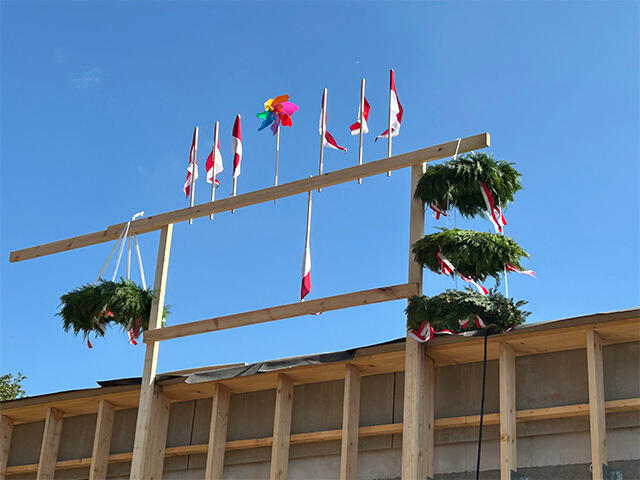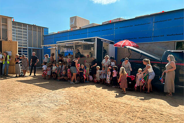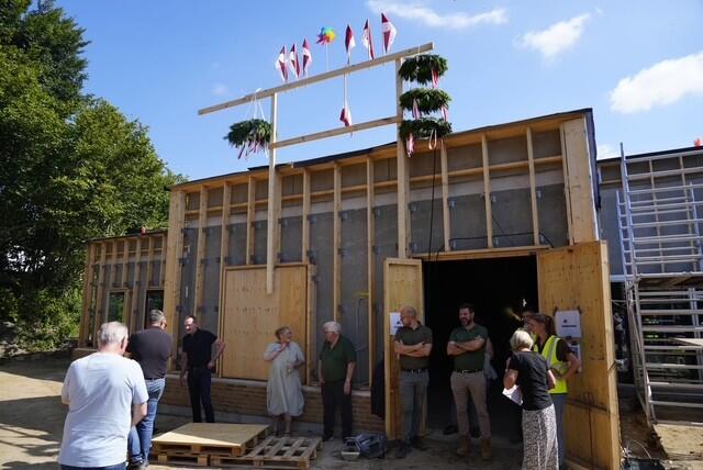 I dag blev en milepæl markeret for det kommende Kongehøjens Børnehus. Der blev holdt rejsegilde med taler, pølser og børnesang og byggeriet blev sendt ind i næste etape.